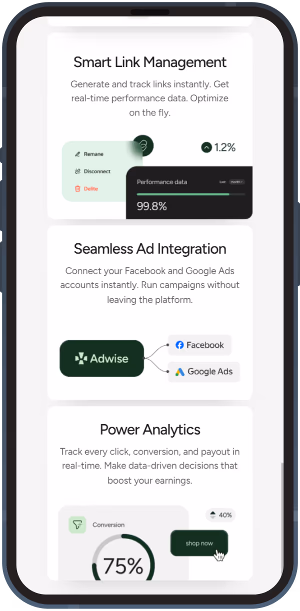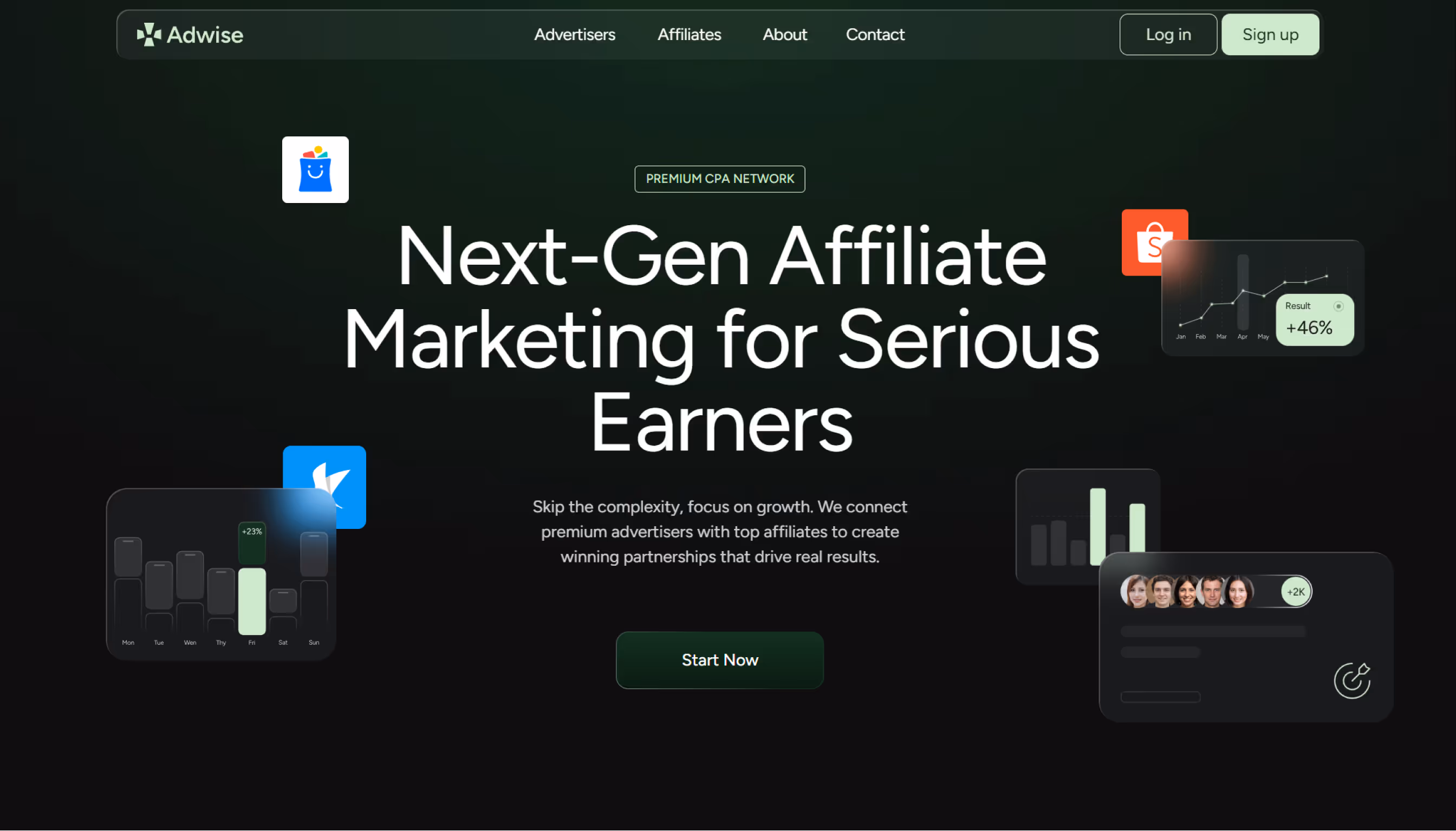 Adwise — компания, которая занимается партнёрским маркетингом. Она объединяет рекламодателей премиум-класса с лучшими аффилированными лицами для создания выигрышных партнёрств, которые приносят реальные результаты. Среди услуг компании — автоматизированное сопоставление рекламодателей с подходящими партнёрами, отслеживание продаж, аналитика в реальном времени и предоставление премиальных функций для профессиональной работы.