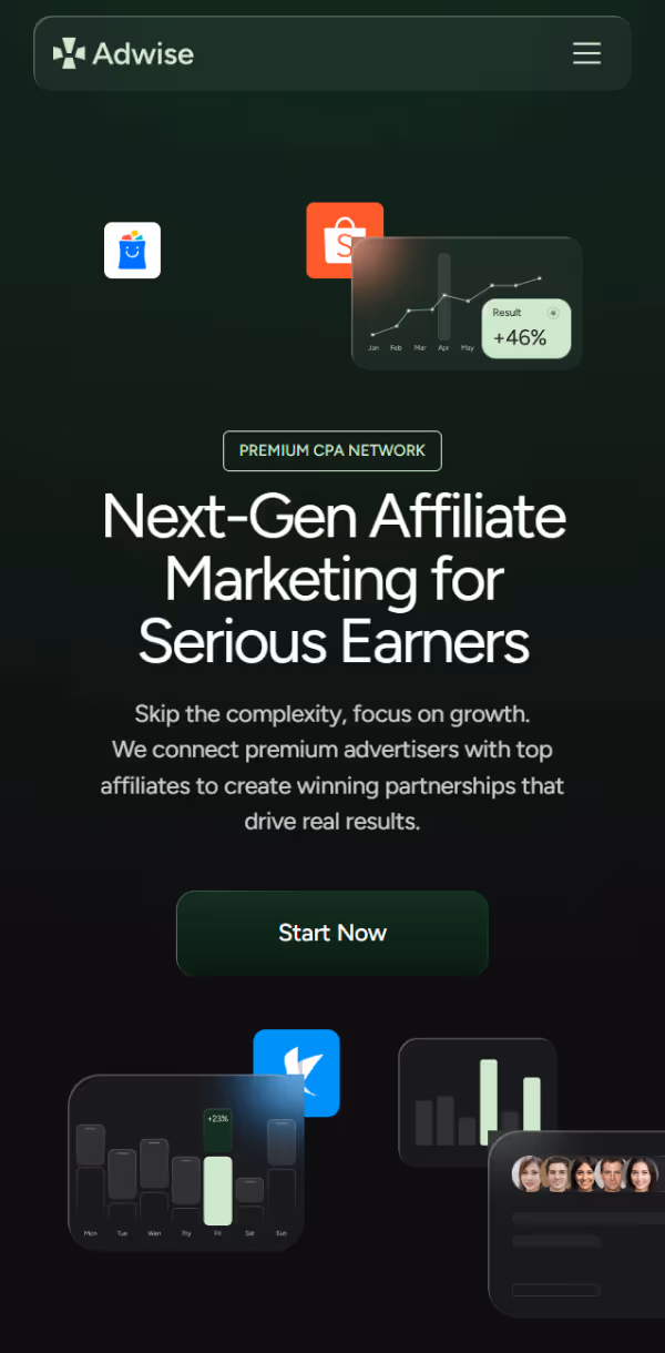 Разработка корпоративного сайта для компании Adwise, которая занимается партнёрским маркетингом. Она объединяет рекламодателей премиум-класса с лучшими аффилированными лицами для создания выигрышных партнёрств, которые приносят реальные результаты.